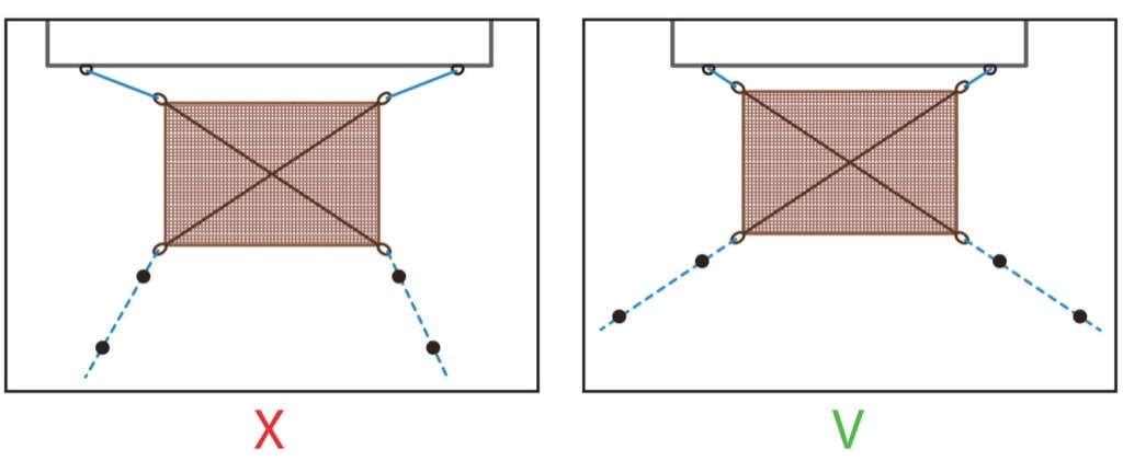 Più i vostri punti di attacco saranno lontani dalla vela (rami d’albero o pali distanti), più sarà necessario che l’attacco e la corda rispettino l’allineamento delle corde incrociate dell’ombrière, come illustrato nello schema qui sotto.