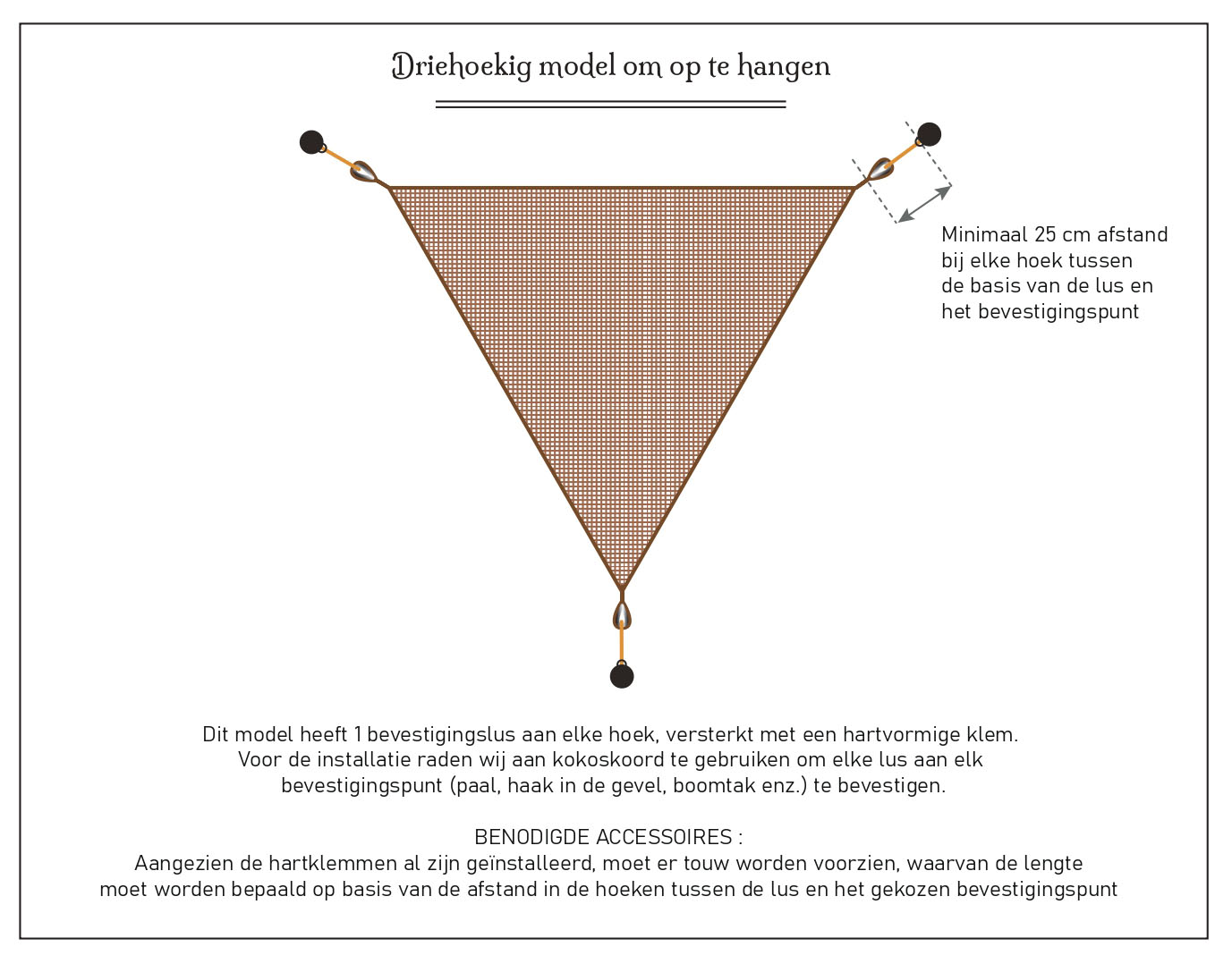 Verbind de 3 reeds versterkte lussen met uw bevestigingspunten (muurankers, palen, bomen of andere) met behulp van kokoskoord of een staalkabel, terwijl u de uitlijning met de mediaan van de driehoek behoudt (zie tweede schema).