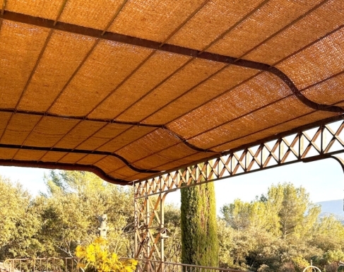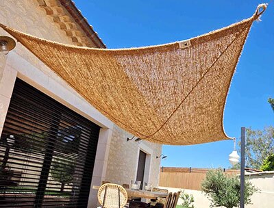 Ce grammage est supérieur à ce qui existe actuellement sur le marché des toiles d’ombrage en fibre de coco. Nous avons souhaité offrir une Ombrière de qualité qui durera plus longtemps tout en gardant les caractéristiques d’un ombrage naturel.